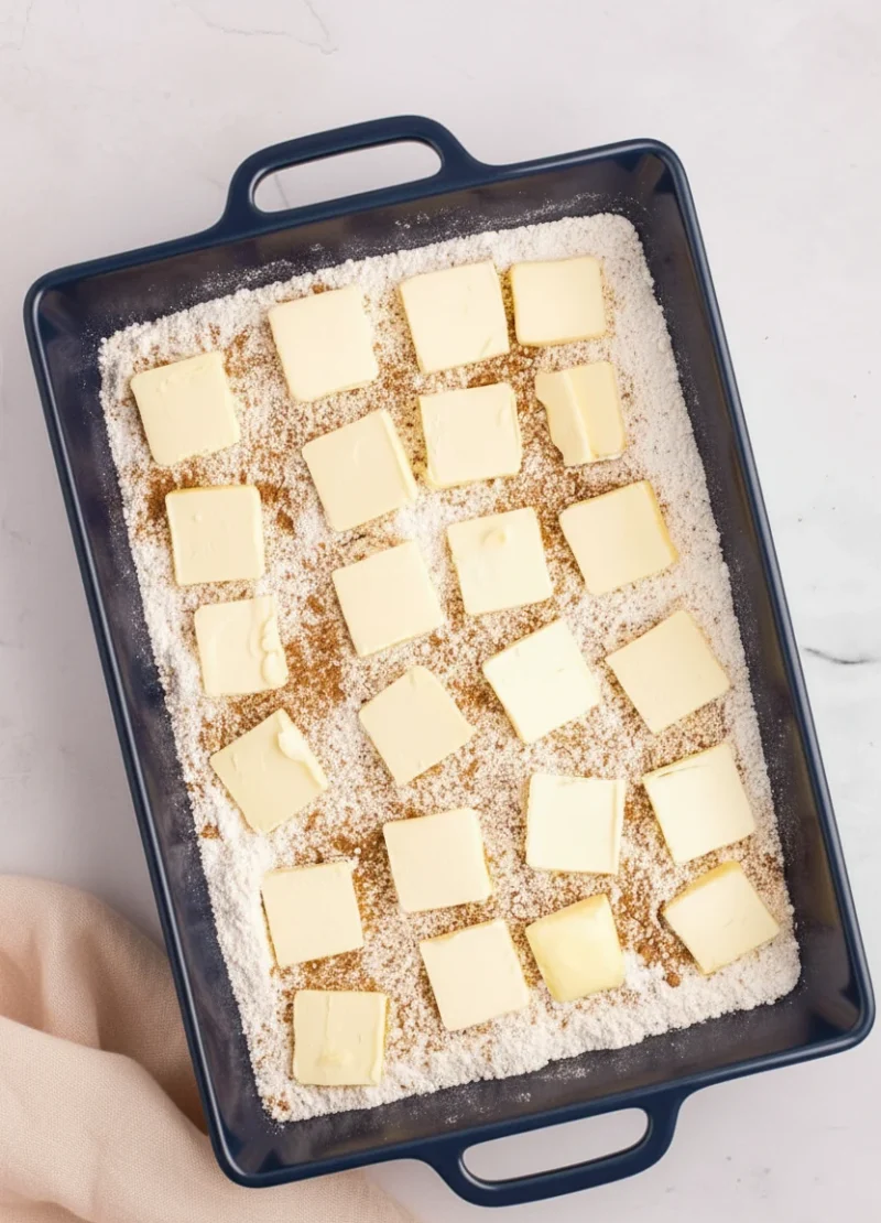 - Top with Butter: Place the pats of your 1 ½ sticks of cold, sliced butter all over the cake mix, making sure to cover it well.