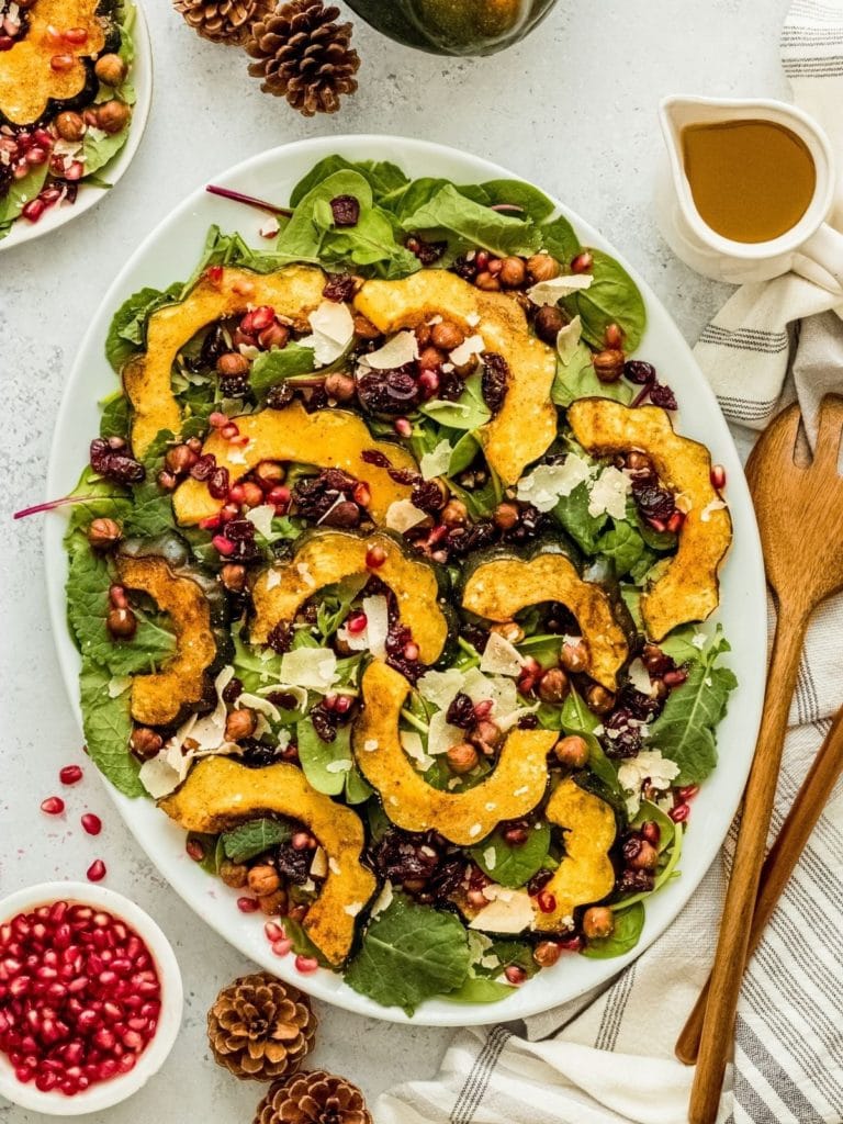 Acorn squash gets so sweet and tender when you roast it. Toss the slices with greens and drizzle maple dressing on top. The maple makes everything taste cozy and warm, perfect for chilly fall days!