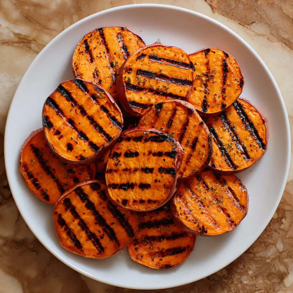 - Sweet potatoes get crispy edges from the hot grill flames.