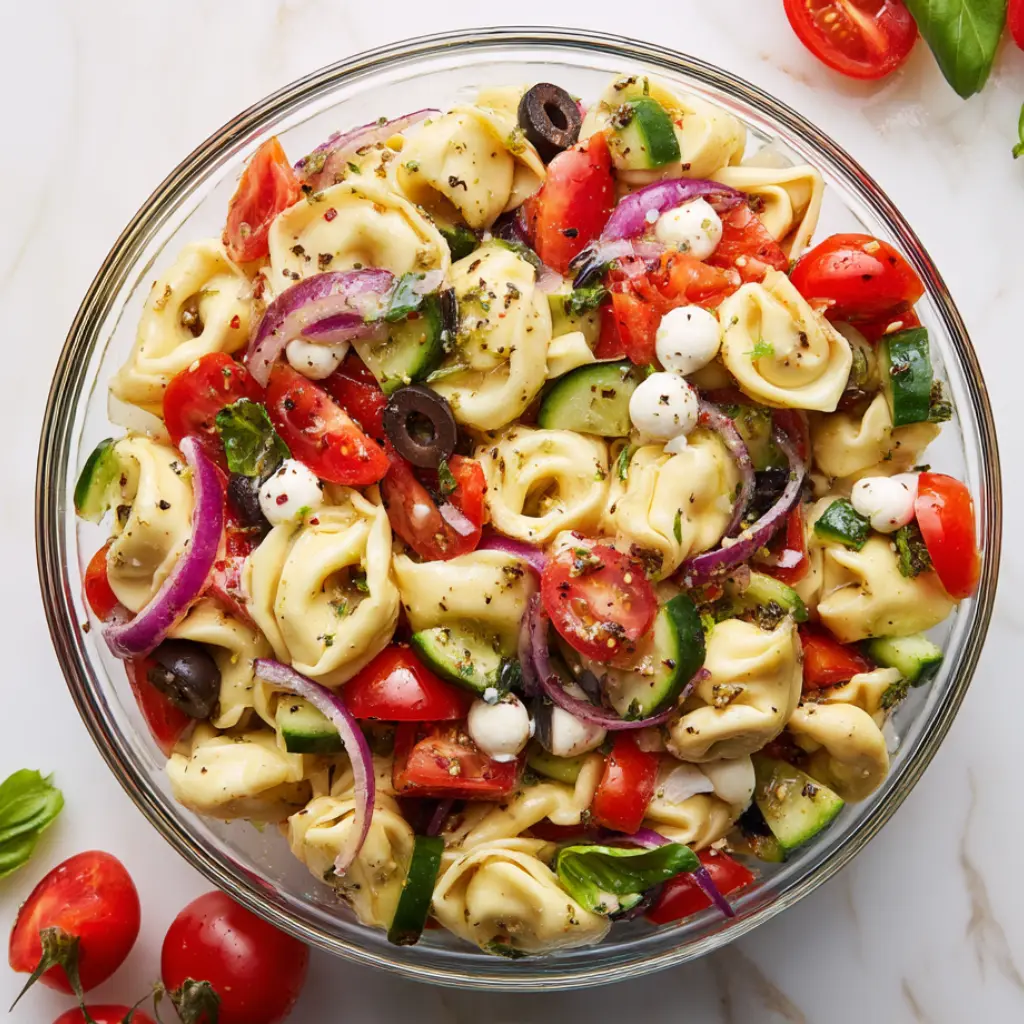 This dish is so yummy and fresh. It has cheese-filled pasta and lots of veggies. I add a tangy dressing that makes it taste amazing.