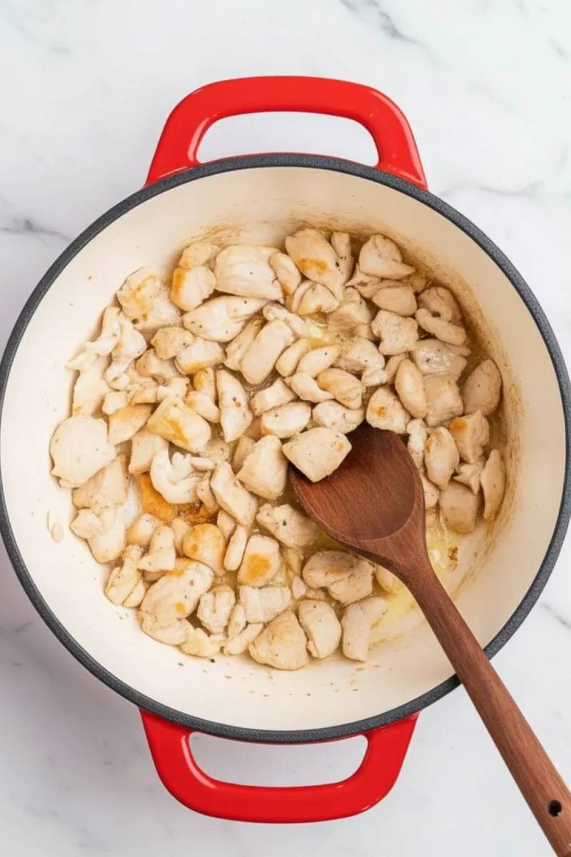 - Sear the chicken: Heat 1 tablespoon of olive oil in a large pot or Dutch oven. Add 1 pound of chicken breast cubes and cook for 4-5 minutes until they are no longer pink.