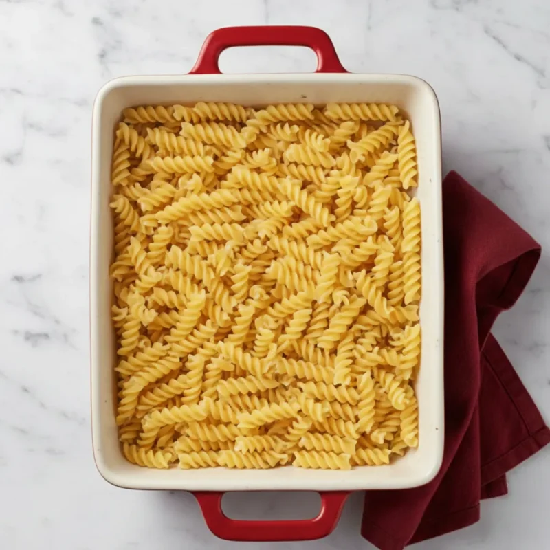 - Prep the oven and pasta: First, preheat your oven to 375°F (190°C). Boil your fusilli pasta in salted water for only 4 minutes, drain it, and pour it right into your casserole dish.