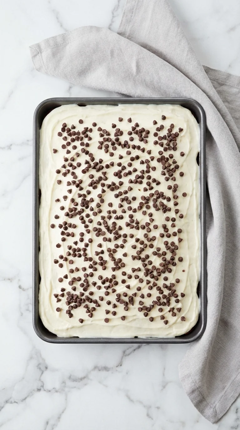- Sprinkle those mini chocolate chips on top and press them down just a little bit.